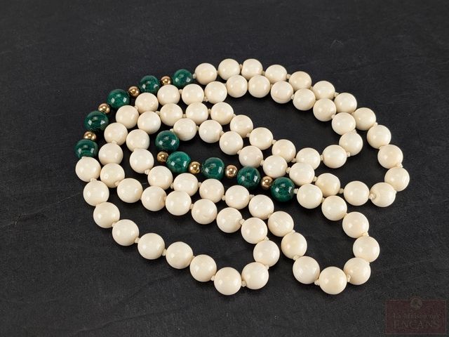Lot # 82 - Collier de billes d'ivoire et de malachite nouées 8.6mm avec or 14k, circa 1950, mesurant 34 pouces de longueur