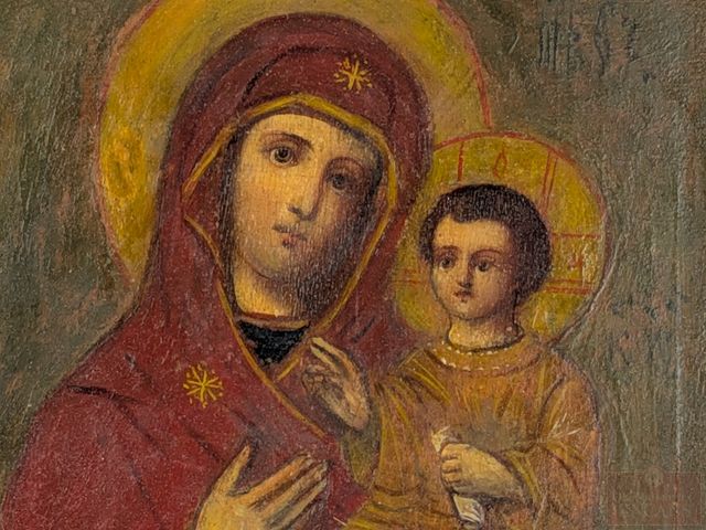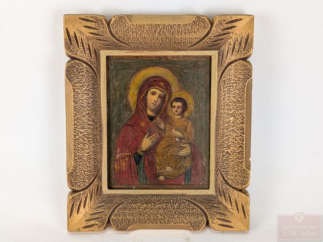 Icône religieuse orthodoxe peinte à la tempera sur bois, représentant la vierge à l'enfant, datant du début du 19eme siècle et mesurant 6.25x4.75 pouces