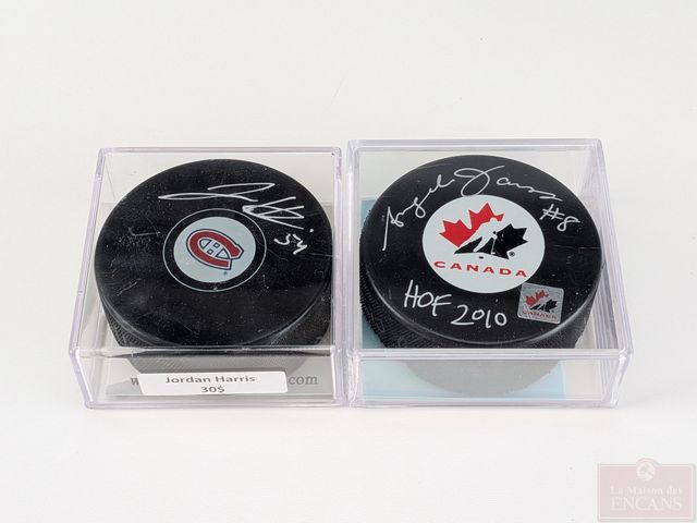 Lot # 15 - Lot de rondelles de hockey de collection, dont une signée par Angela James de Team Canada et une signée par Jordan Harris