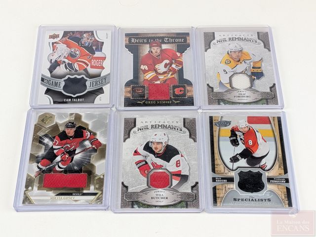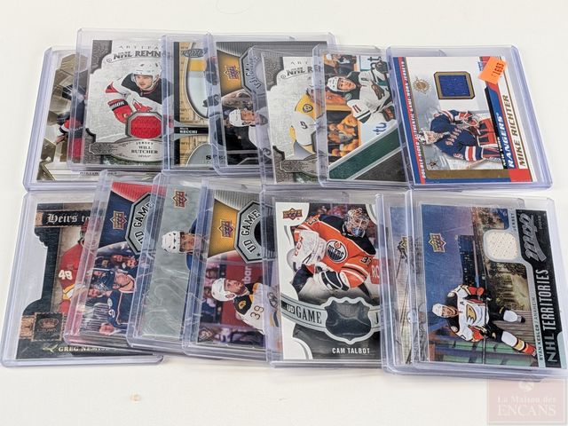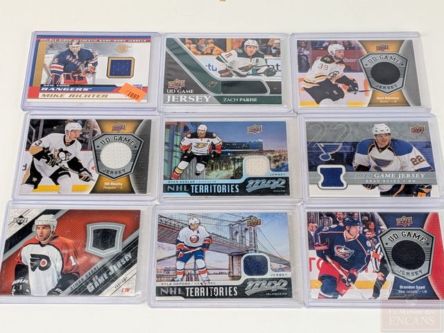 Lot de cartes de hockey Upper Deck, Panini et Pacific avec morceaux de chandails Game Used