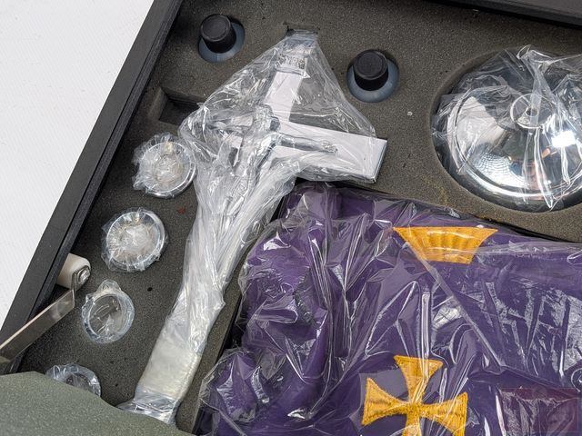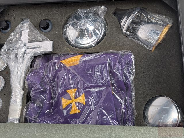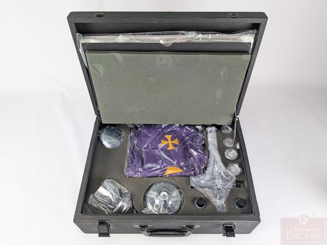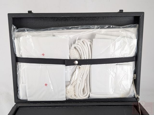 Lot # 51 - Valise contenants vêtements et items religieux pour sacrements, utilisés par les prêtres pour effectuer des messes et rituels de fin de vie lors de voyages, la valise mesurant 18 pouces de largeur