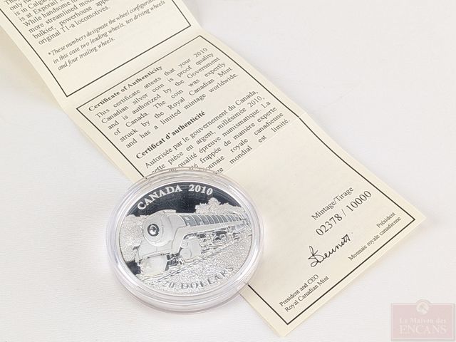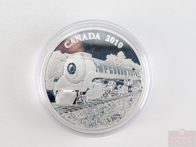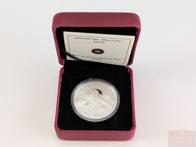 Pièce canadienne d'une once d'argent pur 9999 vingt dollars 2010 Locomotive Selkirk, encapsulée, dans son coffret avec son certificat, sans taxes