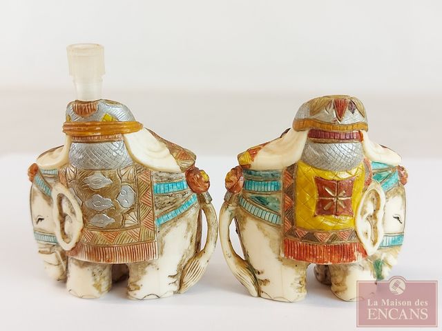 Deux bouteilles à priser sur ivoire peintes à la main, représentant des éléphants et mesurant 2 pouces chacune