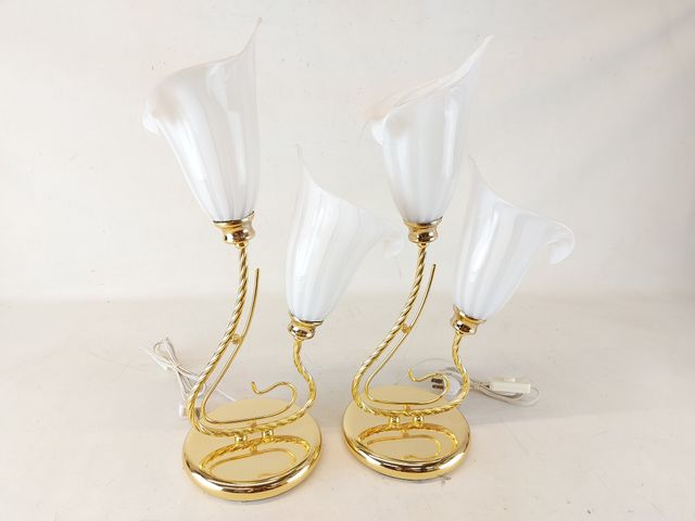 Lot # 63 - Jolie paire de lampes en verre de Murano entièrement soufflées à la main modèle Calla Lily nommé ainsi à cause de la représentation de la fleur sur de magnifiques bases très élégantes. Circa 1970 en excellente condition et fonctionnelles. 20.5 pouces de hauteur. Les deux portant le label Made in Italy. SOLD
