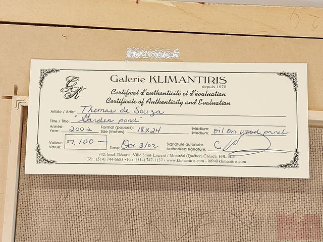 Lot # 58 - Thomas de SOUZA - Huile sur panneau signée mesurant 18x24 pouces titrée Garden Pond avec certificat de la galerie Climantiris de 1100$ SOLD