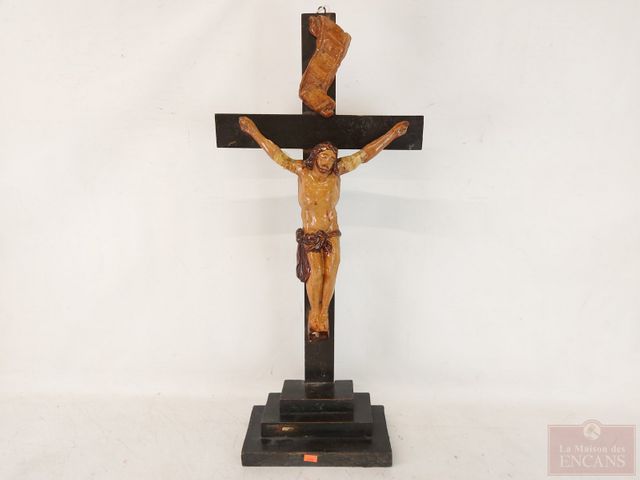 Lot # 38 - Ancien crucifix en bois et plâtre datant du 19em siècle. Mesurant 25 pouces de hauteur. Bras recollés VENDU