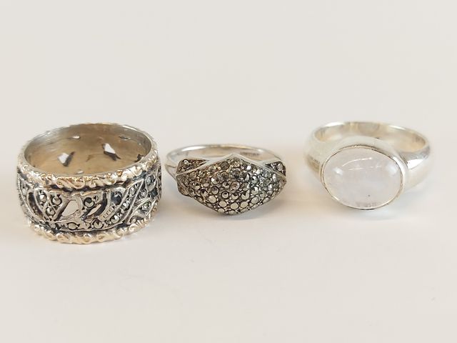 Lot # 33 - Lot de trois bagues en argent dont une sertie d'une pierre de lune - taille 6 - 6.5 - 7 SOLD