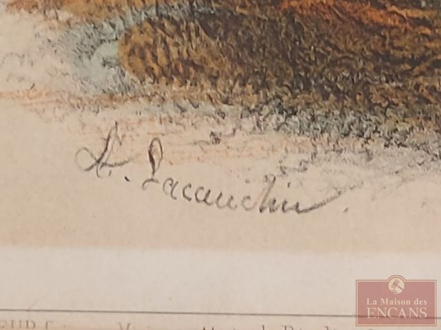 Lot # 35 - Lithographie aquarellée à la main par A. Lacouchie présentant une scène amérindienne, titrée ''Costumes Sauvages'', circa 1850 et mesurant 10x8 pouces VENDU