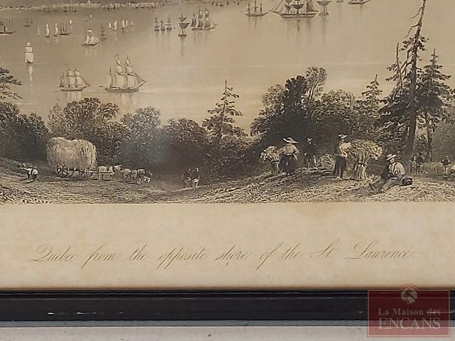 Gravure titrée ''Québec From The Opposite Shore of the Saint-Lawrence" faite pr W.H Bartlett, datant du 19eme siècle et mesurant 5x7 pouces