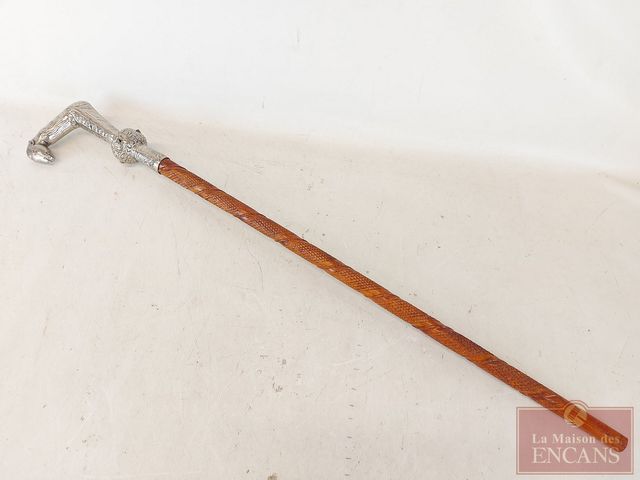 Lot # 45 - Canne sculptée sur bois avec tête en métal argenté représentant un agneau, finement sculptée et ciselée et mesurant 35 pouces de hauteur teur VENDU
