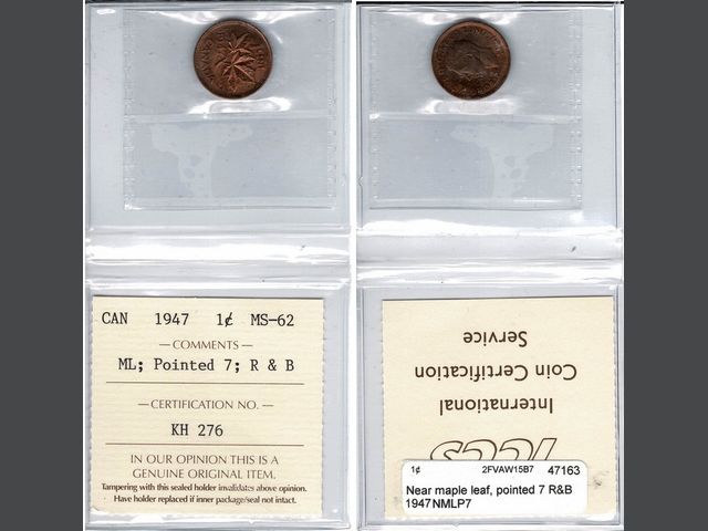Lot # 195 - 1 Cent 1947 certifié, à l'état neuf. Avec la feuille d'érable proche et le 7 pointu. SOLD