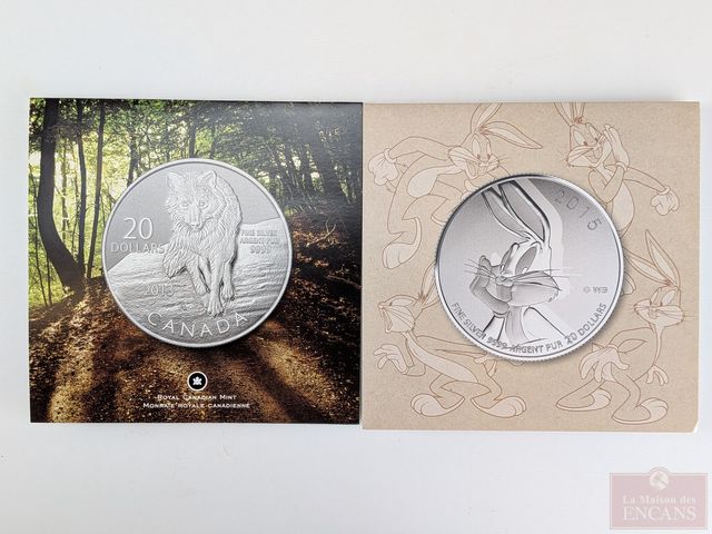 Deux pièces canadiennes de vingt dollars 2013 et 2015 en argent pur 9999, encapsulées, sans taxes