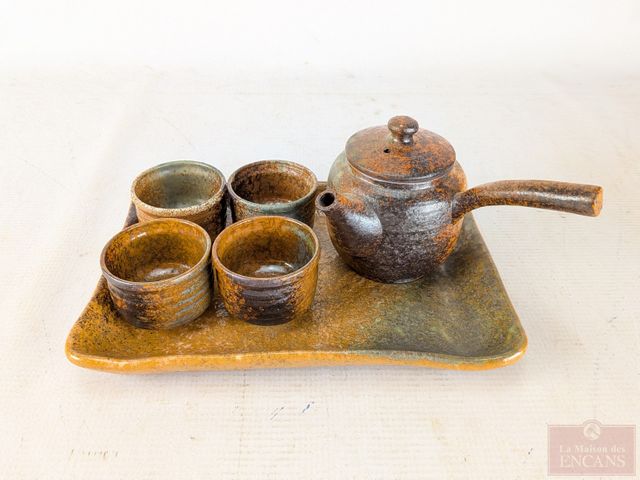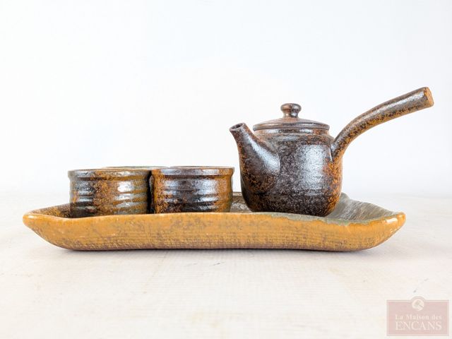 Lot # 35 - Ensemble de service à thé en céramique, comprenant théière, tasses et plateau de service mesurant 7x9.5 pouces