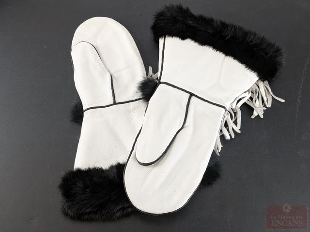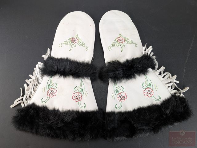 Lot # 59 - Paire de mitaines autochtones en cuir et fourrure, brodées à la main et mesurant 14 pouces de longueur