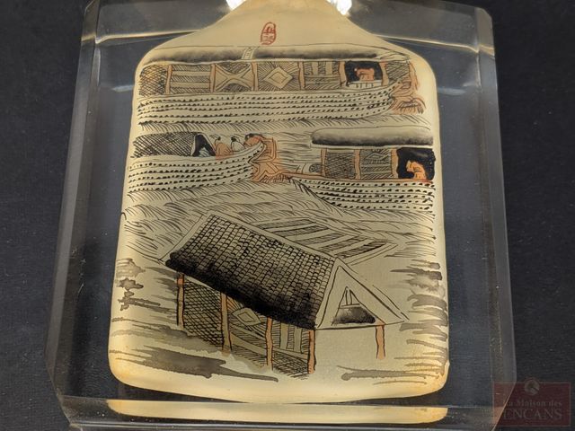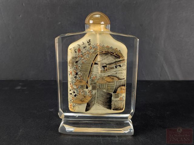Lot # 93 - Bouteille à priser avec cuillère sculptée sur ivoire et bouchon en agate, délicatement peinte à la main de l'intérieur de la bouteille, mesurant 4.75 pouces de hauteur