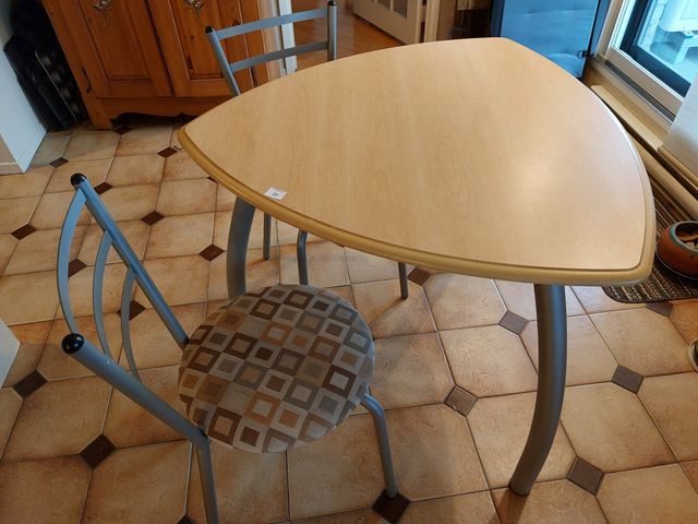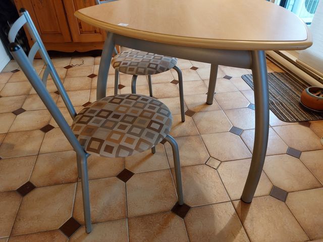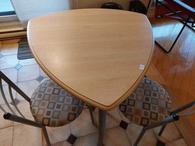 Ensemble table et deux chaises - la table mesurant 36x36x31 pouces et les chaises mesurant 16x16x33 pouces de hauteur