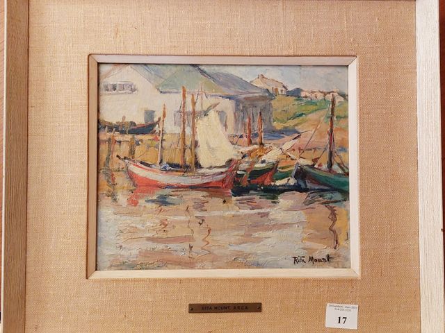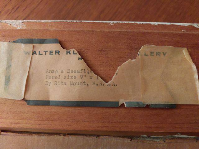 Lot # 17 - MOUNT ,Rita - Huile sur panneau signée et titrée Anse à Beaufils Gaspé - avec étiquette de la galerie Klinkhof - mesurant 9x11 pouces VENDU