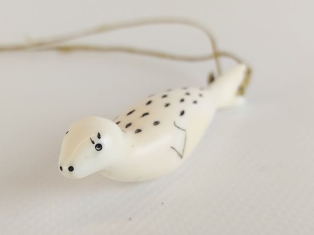 Lot # 222 - Pendentif esquimau sculpté sur ivoire - représentant un phoque - 2.80 pouces de longueur - corde en tendon de caribou SOLD