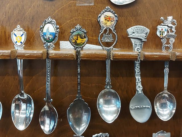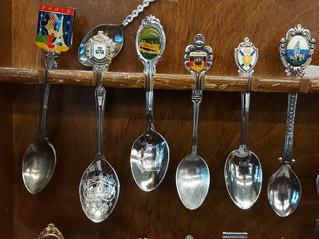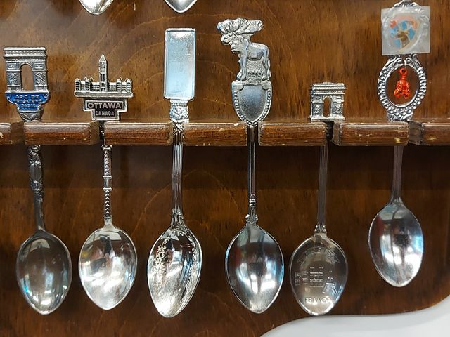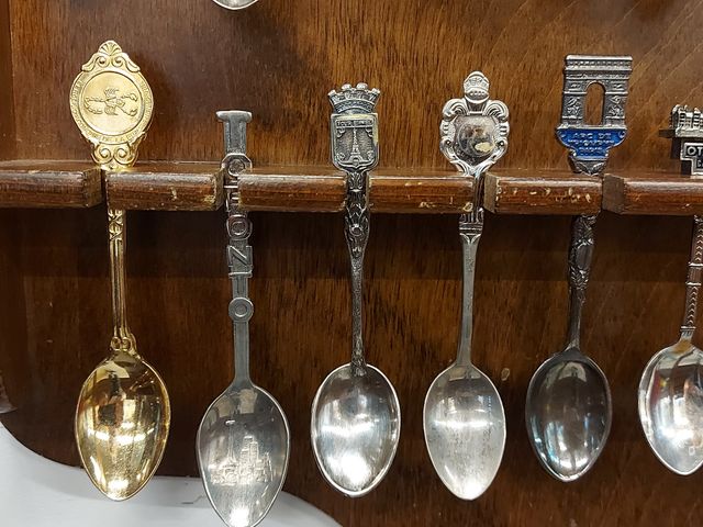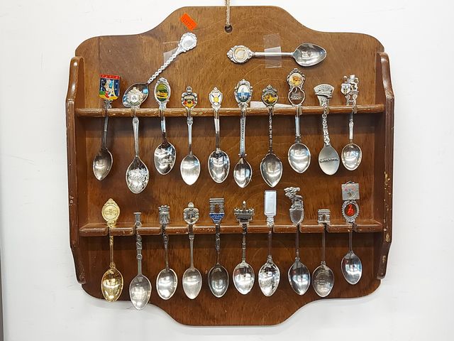 Lot # 33 - Lot de cuillères de collection vintages dans son présentoir mesurant 15.5 pouces de hauteur SOLD
