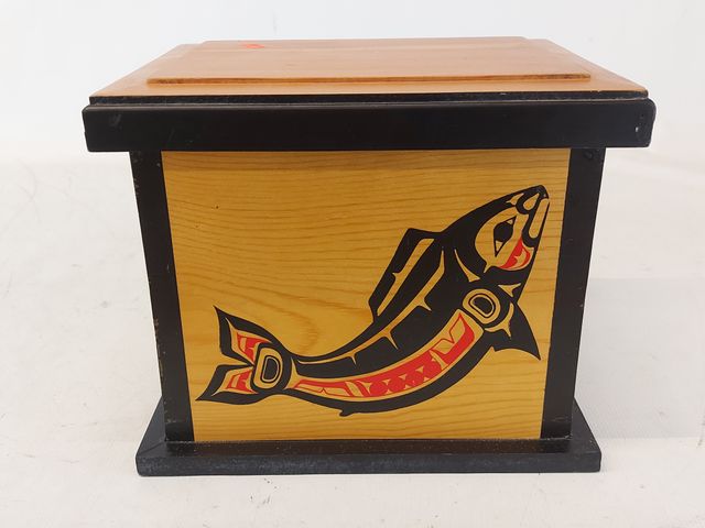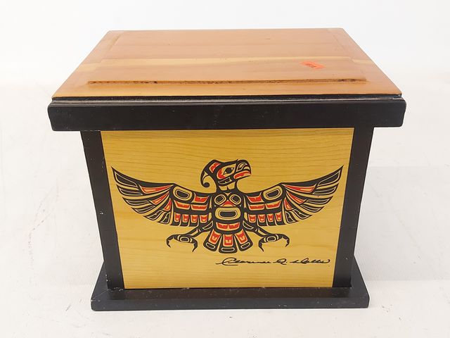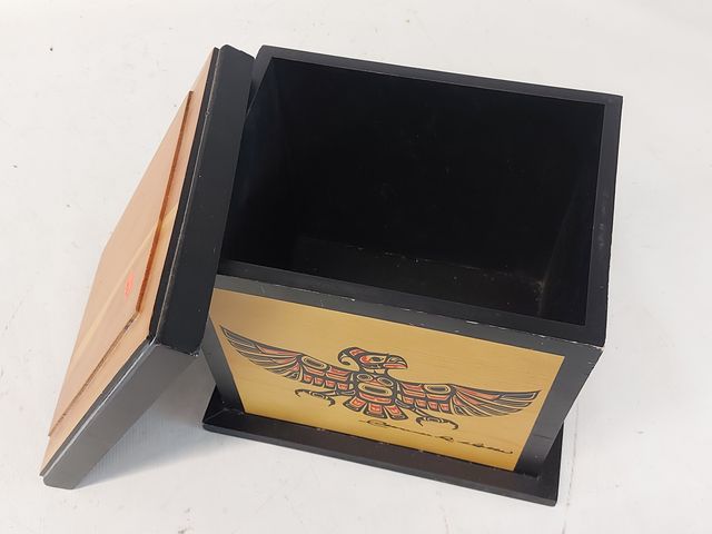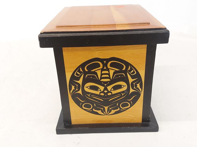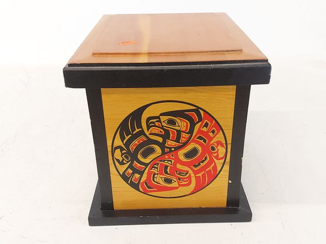 Lot # 122 - Boite haïda en bois design par Clarence Wells mesurant 7.5 pouces de hauteur SOLD