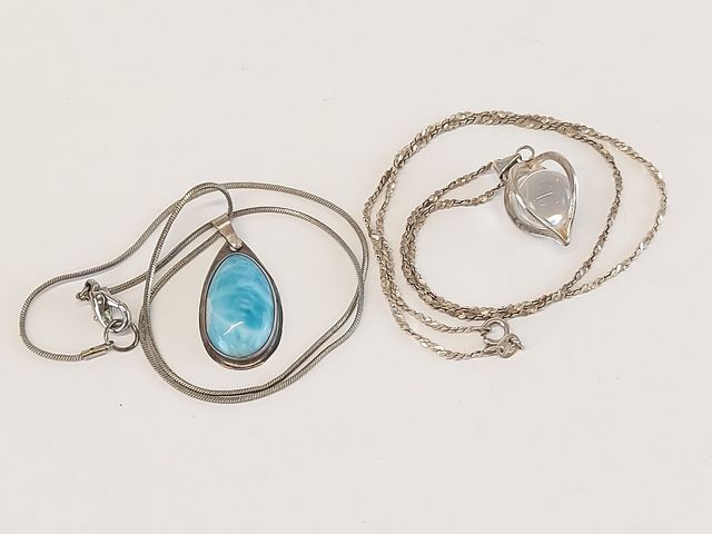 Lot # 150 - Deux chaines en argent avec pendentifs en argent la plus grandes mesurant 18 pouces de longueur SOLD
