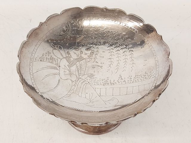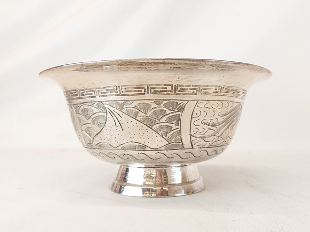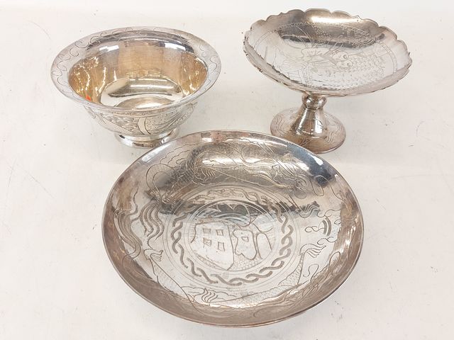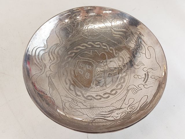 Lot # 57 - Trois centres de table chinois en métal argenté ciselés à la main le plus grand mesurant 10 pouces de diamètre SOLD