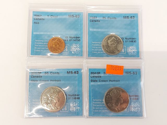 Lot # 83 - Lot de pièces de monnaies canadiennes gradées dont 50 sous 2022 P MS63, 50 sous 2002 P MS63, 25 sous 1987 MS63 et 1 sous 1967 MS63 SOLD