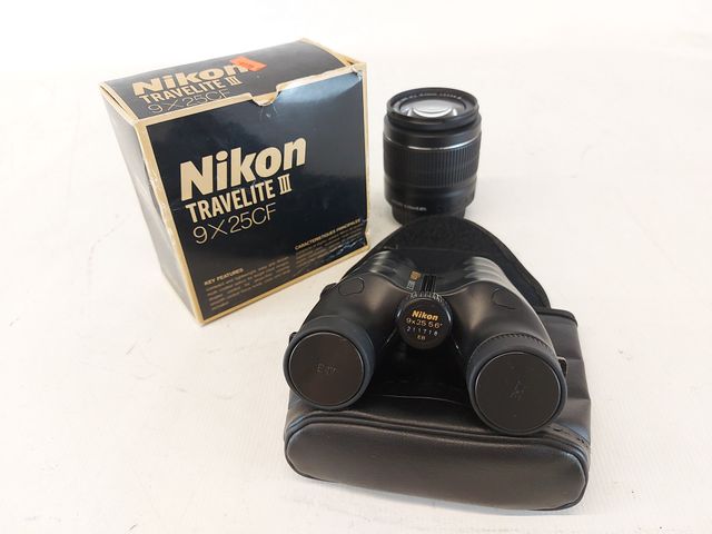 Paire de longue-vue Nikon Travelite III 9X25CF dans sa boite d'origine et son étui de transport et ses papiers et lentille Canon 1855 mm EF-S 18-55mm