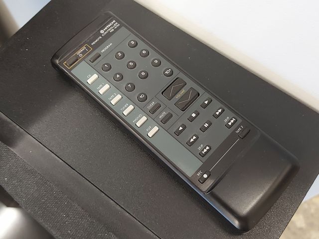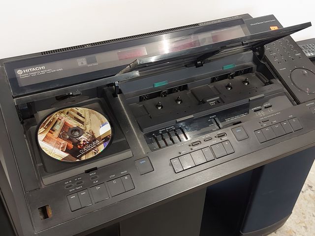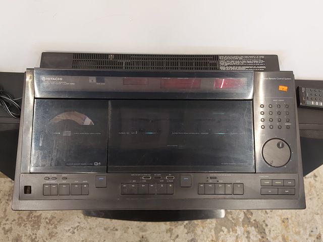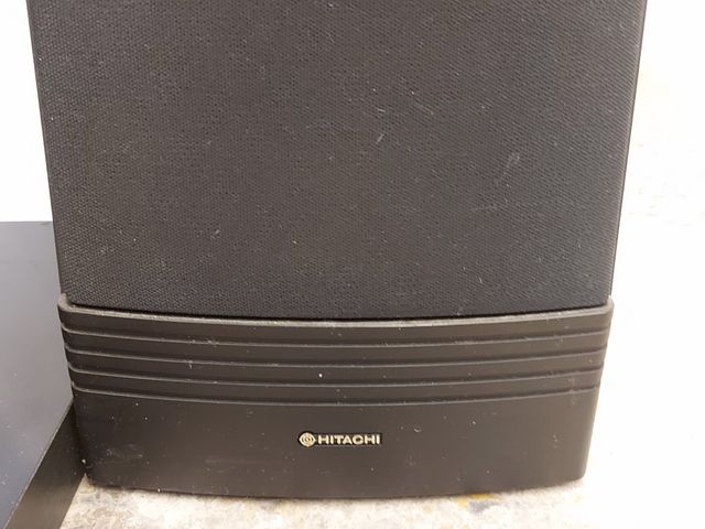 Lot # 19 - Système de son vintage Hitachi modèle MX-W50 avec ses d'haut-parleurs et télécommande, mesurant 33 pouces de hauteur, fonctionnel SOLD