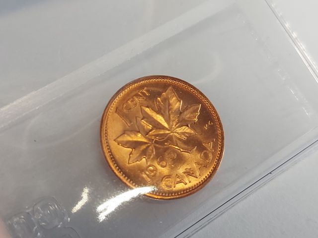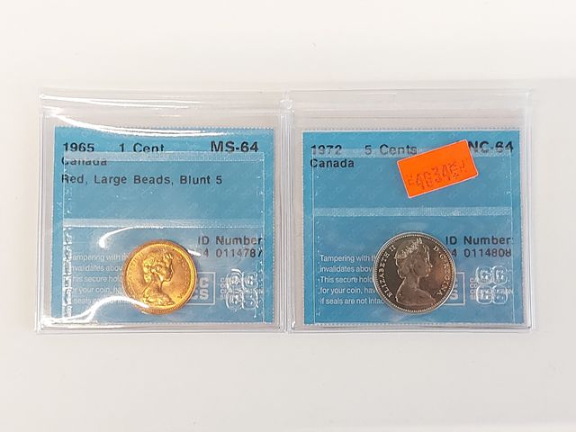 Lot # 80 - Deux pièces de monnaie canadiennes gradées dont 1 sous 1965 MS64 et 5 sous 1972 UNC64 SOLD