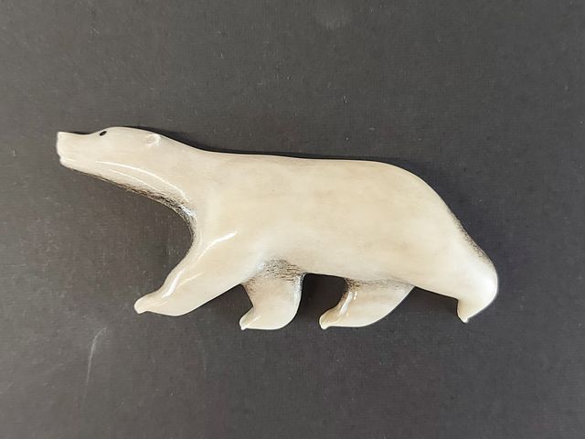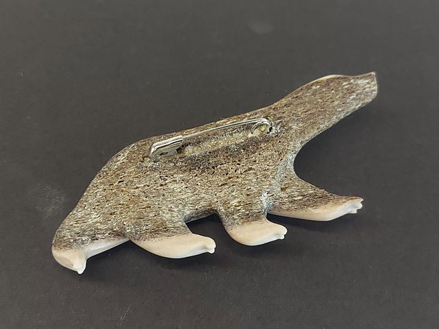 Broche inuite représentant un ours polaire sculptée sur bois de caribou mesurant 3.25 pouces de longueur