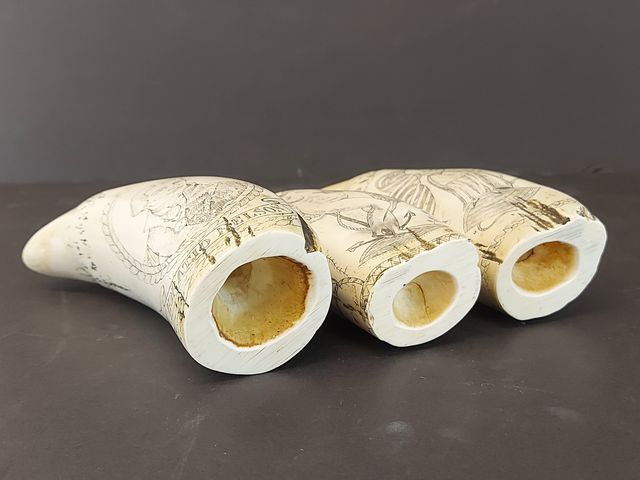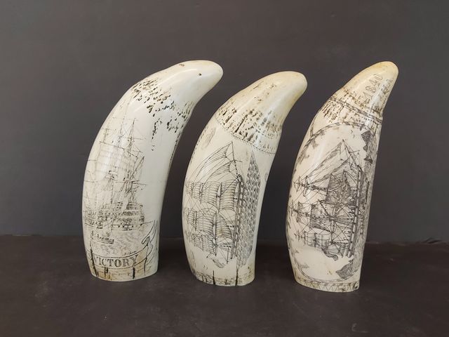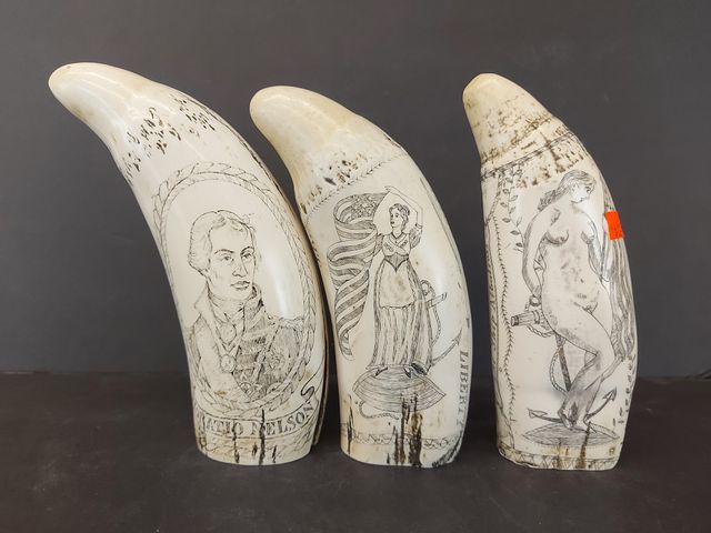 Lot # 123 - Trois reproductions muséales en résine d'œuvres scrimshaw finement sculptées sur dents de baleine mesurant 6.25 pouces de hauteur SOLD