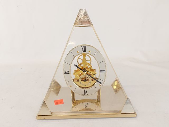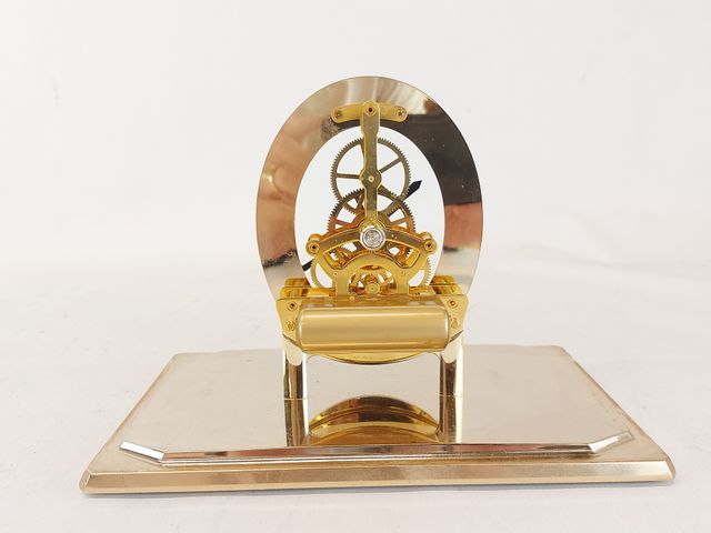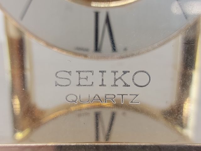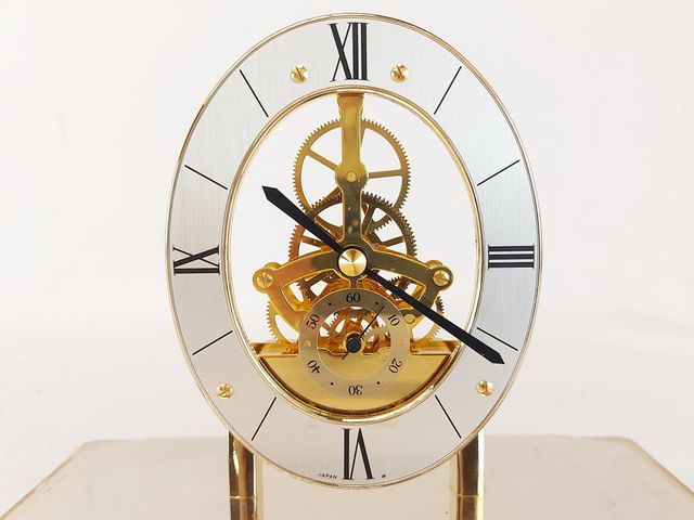 Horloge Seiko au quartz faite au Japon base en laiton doré mouvement squelette mesurant 8.75 pouces de hauteur telle quel