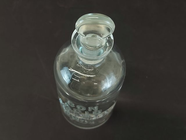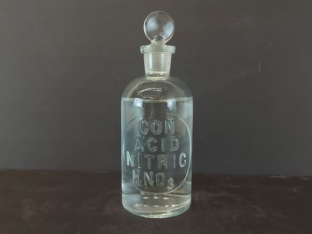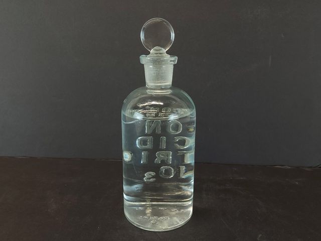 Lot # 103 - Bouteille de laboratoire en verre acide nitric HNO3 avec son bouchon mesurant 7 pouces de hauteur SOLD