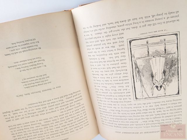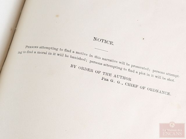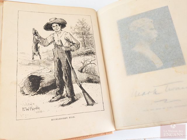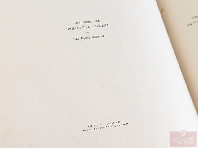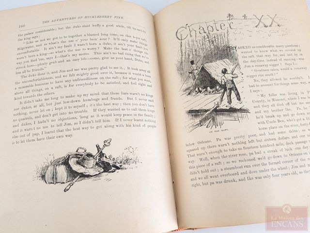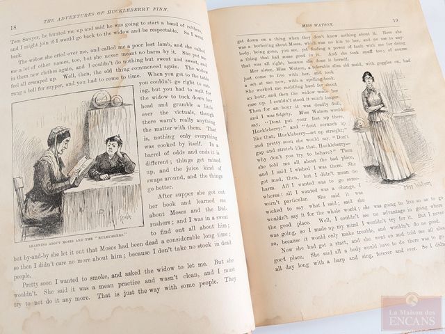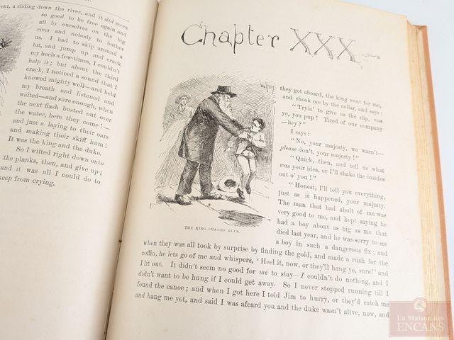 Première édition du livre The Adventures of Huckleberry Finn de Mark Twain, édité à New-York en 1885, comprenant plus de cent-soixante-dix illustrations et mesurant 9.5 pouces