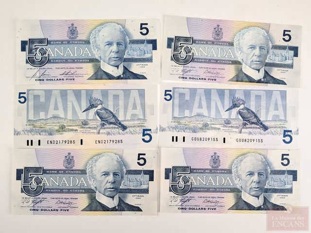 Lot # 85 - Lot de billets canadiens incirculés, comprenant deux dollars 1974, trois billets de dix dollars 1989 et six billets de cinq dollars 1986