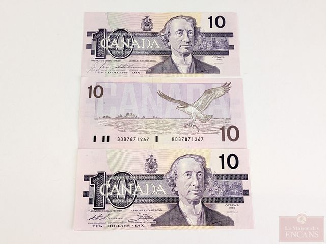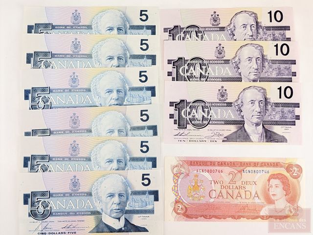 Lot de billets canadiens incirculés, comprenant deux dollars 1974, trois billets de dix dollars 1989 et six billets de cinq dollars 1986