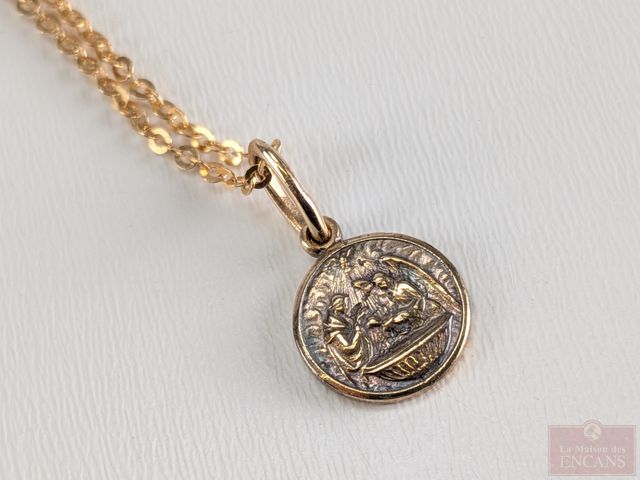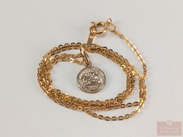 Lot # 73 - Pendentif et chaine en or 10k représentant une scène religieuse, la chaine mesurant 16 pouces de longueur