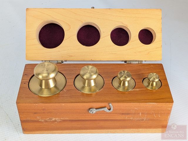 Lot # 43 - Ensemble de poids de balance vintages en laiton, comprenant cent, deux-cent, cinq-cent et mille grammes, dans leur boite en bois mesurant 7.75 pouces de largeur