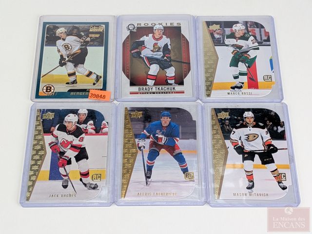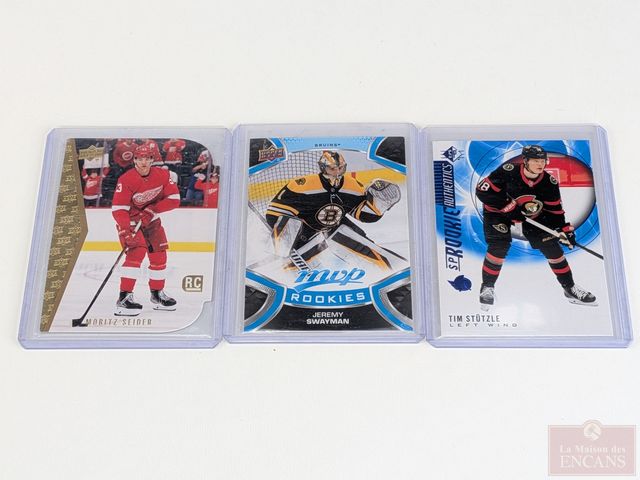 Lot # 74 - Lot de cartes de hockey Upper Deck comprenant Tom Stützle Rookie, Moritz Seider, Jeremy Swayman Rookie, Mason McTavish, Jack Hughes, Alexis Lafrenière, Marco Rossi, Patrice Bergeron et Brady Tkachuck