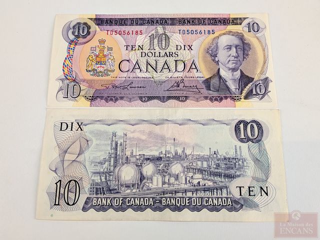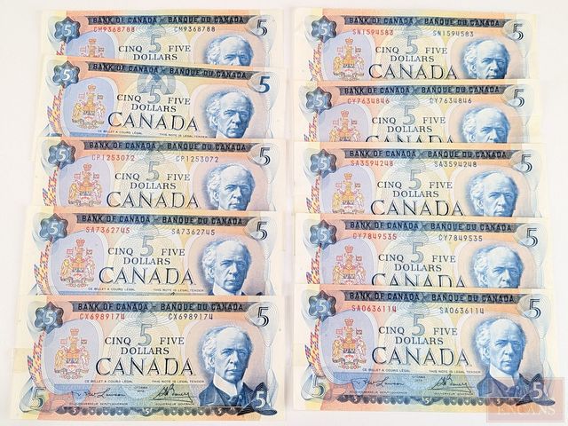 Lot de billets canadiens comprenant dix billets de cinq dollars 1972 et deux billets de dix dollars 1971