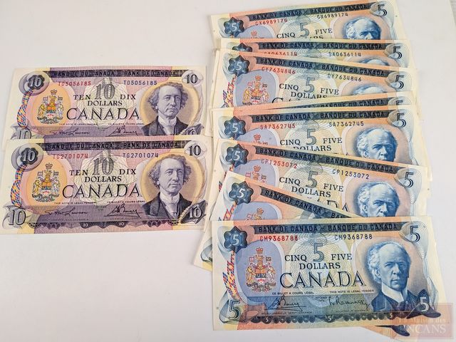 Lot # 115 - Lot de billets canadiens comprenant dix billets de cinq dollars 1972 et deux billets de dix dollars 1971