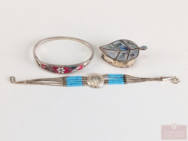Deux bracelets en argent et pilulier en argent, dont bracelet navajo avec turquoises, mesurant 7 pouces de longueur