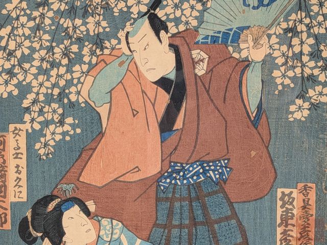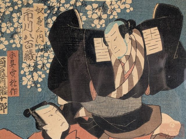 Deux estampes japonaises représentant des scènes de théâtre et mesurant 14x10 pouces chacune