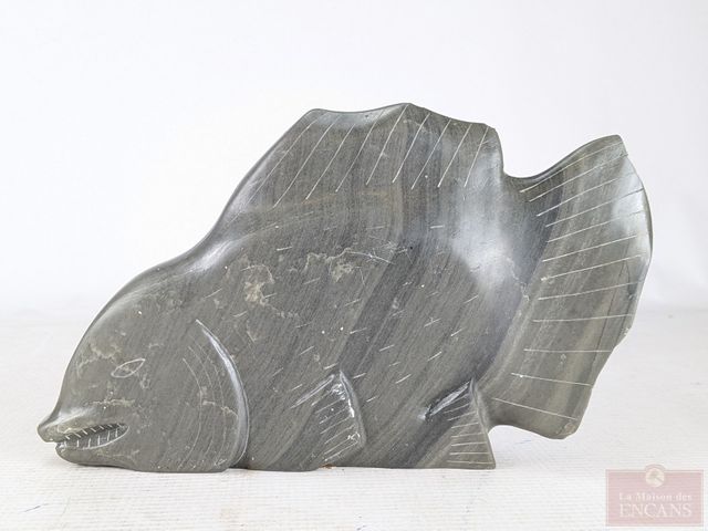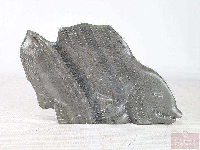 Sculpture inuite sur pierre à savon, signée et mesurant 9.5 pouces de longueur, avec son étiquette