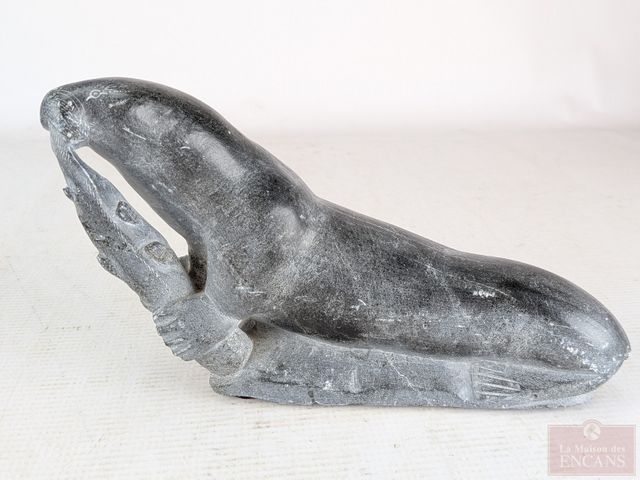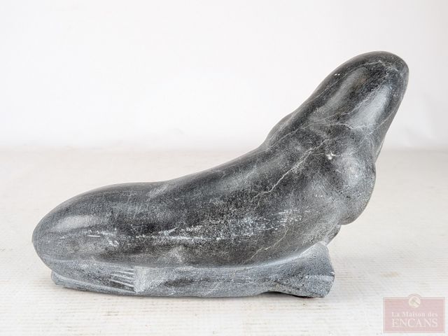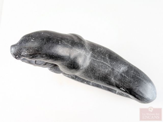 Lot # 141 - DANIEL- Sculpture inuite sur pierre à savon, signée, représentant un phoque chassant un poisson et mesurant 10.25 pouces SOLD