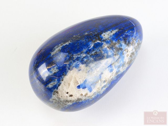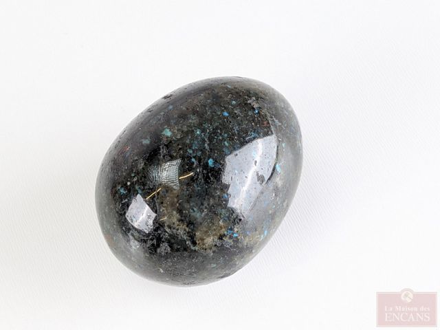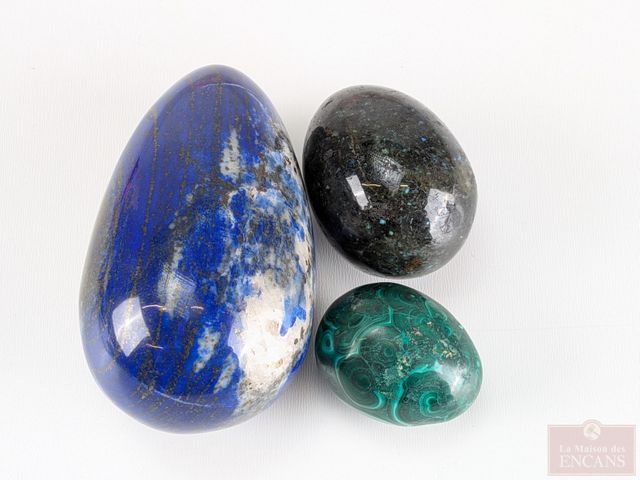 Trois œufs sculptés sur lapis-lazuli, malachite et labradorite, le plus grand mesurant 3 pouces