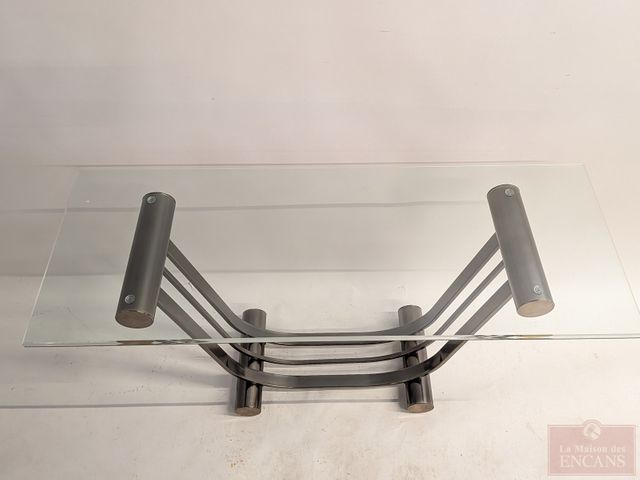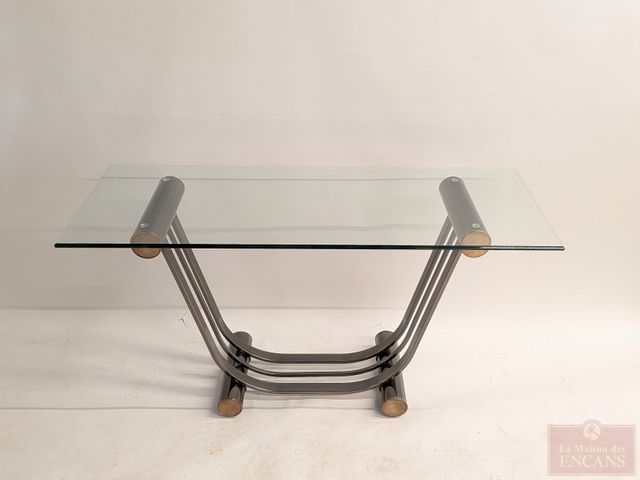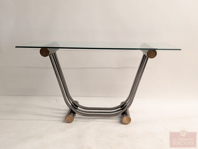 Lot # 10 - Console design Institute of America en métal avec dessus en verre, mesurant 48x18x26.5 pouces
