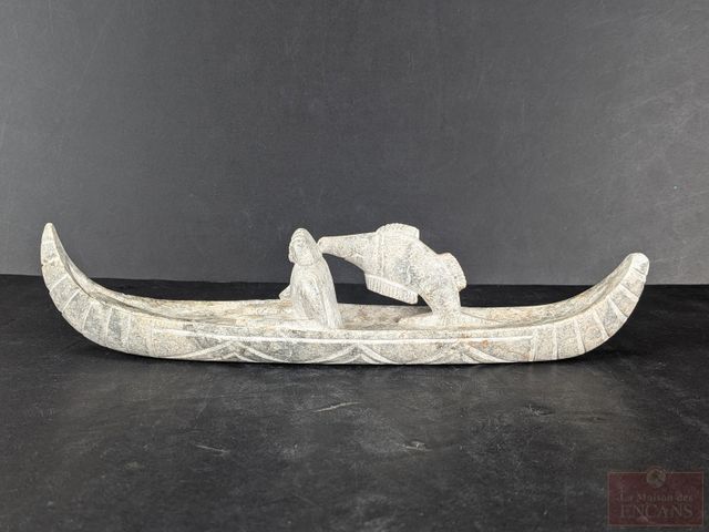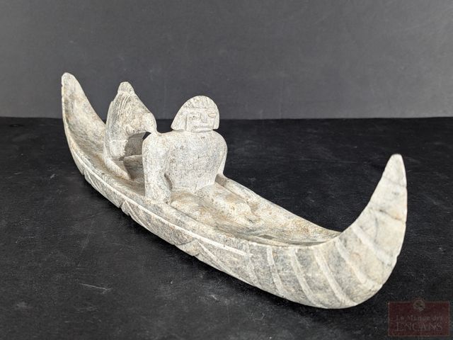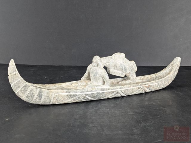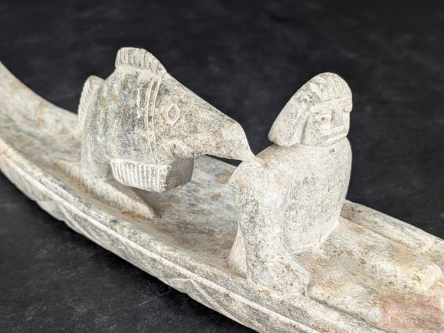 Lot # 32 - Sculpture sur pierre à savon représentant un pêcheur en canot et mesurant 11.5 pouces de longueur