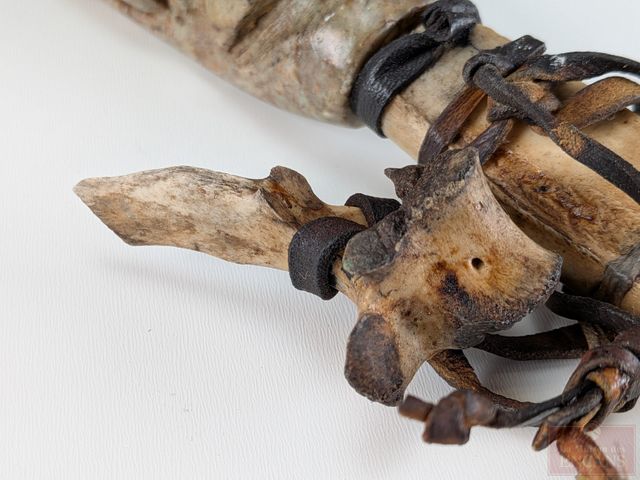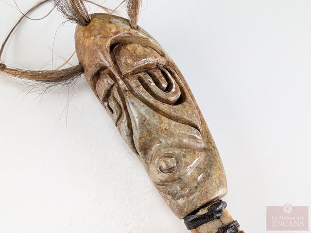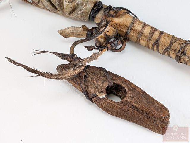 Lot # 83 - Hochet de rituel africain sculpté sur os, pierre et bois avec rubans en suède et crins, mesurant 12 pouces de hauteur